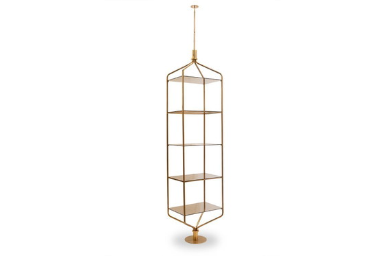 Mensola o libreria autoportante in ottone dorato con cinque ripiani rettangolari in vetro fumé. Si fissa a pavimento e a soffitto a pressione tramite due montanti (uno dei quali regolabile in altezza). Il suo design girevole permette di orientarla per adattarsi a qualsiasi spazio. Artigianato francese, realizzato negli anni '70.