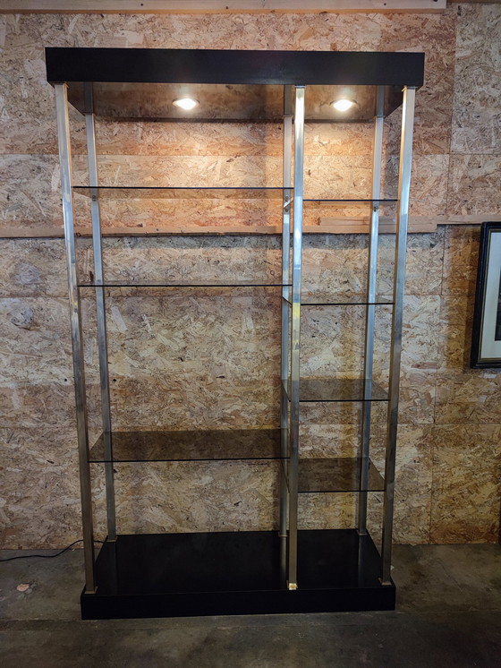 Designer belga. Anni '70. Due punti luce diffondono la luce attraverso i ripiani in vetro fumé. I montanti sono dorati, tipici di Belgo Chrom. In ottime condizioni, con qualche segno di usura, visibile nelle foto.
