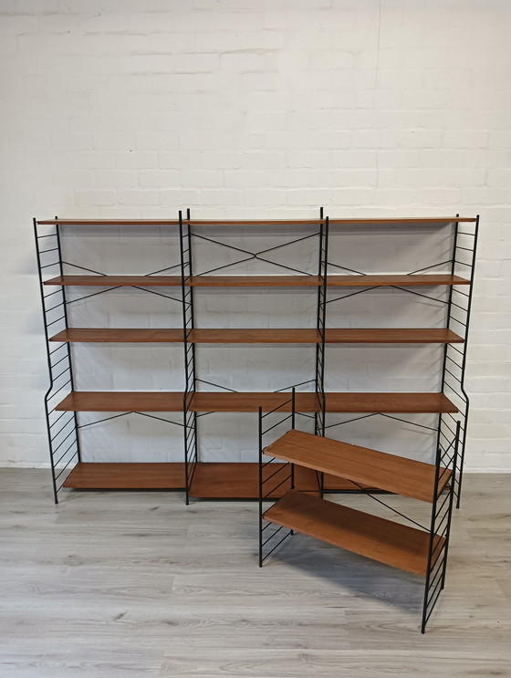 Splendidi mobili in teak impiallacciato con montanti dalla forma elegante. Le sezioni inferiori sono più basse e profonde di quelle superiori. Possono essere posizionate indipendentemente o una sopra l'altra. Un ripiano più profondo. I ripiani possono essere posizionati all'altezza desiderata. Tuttavia, le staffe di supporto centrali nella parte inferiore sostengono due ripiani, garantendone l'allineamento. In alternativa, è possibile utilizzare meno ripiani utilizzando staffe che supportano un solo lato (solo l'estrema sinistra e l'estrema destra). Molto robusto con le quattro traverse sul retro. In buone condizioni vintage. Tuttavia, i 65 anni hanno lasciato alcuni segni sul metallo e sui ripiani. Vedi foto. Splendide venature del legno.