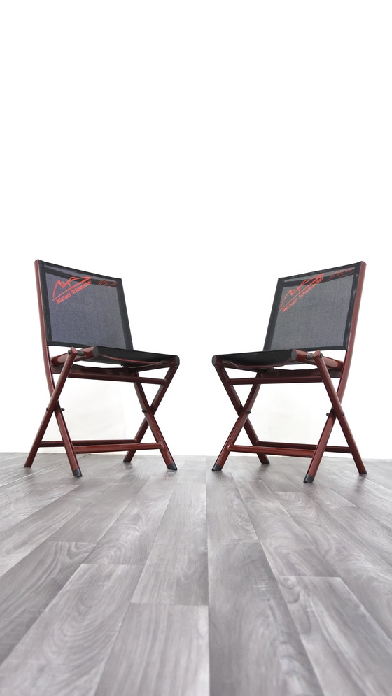 Iconico set di due sedie pieghevoli in metallo laccato rosso con seduta e schienale in tessuto tecnico nero, entrambe personalizzate con logo e firma di Michael Schumacher.