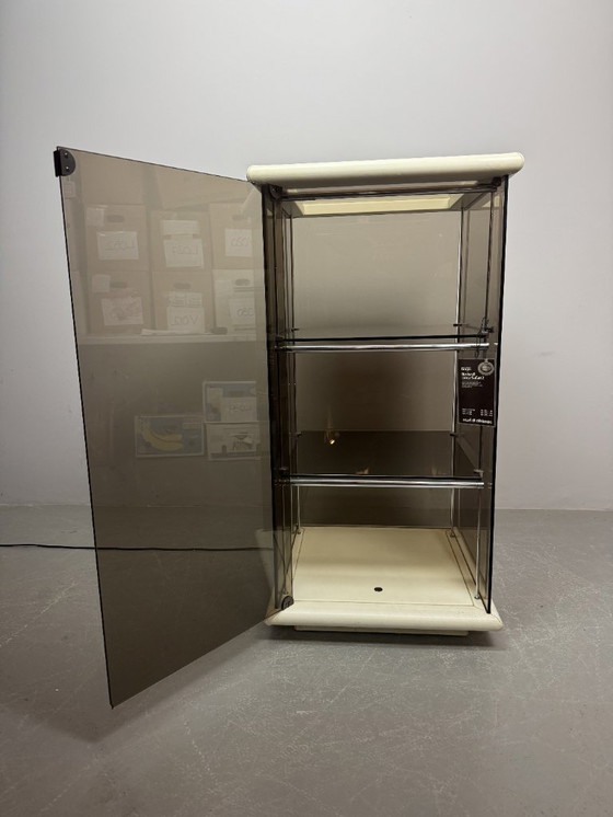 Mid-Century Italian Design 'Bogo' Vetrinetta Showcase Cabinet Designed by Carlo Bartoli for Rossi di Albizzate, Italy 1970s. An sophisticated Italian showcase cabinet, model BOGO, designed by Carlo Bartoli for Rossi di Albizzate, Italy 1970s, from the Redwall Linea Safari 2 collection. Executed in smoked glass with refined leather edge detailing, the cabinet features a glazed door with a minimal metal handle and subtle integrated interior lighting arranged on three levels. A distinguished example of Italian modern design, combining transparency, material richness and understated craftsmanship. A highly unusual and collectible cabinet. Condition note: a small chip “mouse bite” to one corner of the glass door. Dimensions: Height 120 cm, Width 60 cm, Depth 60 cm