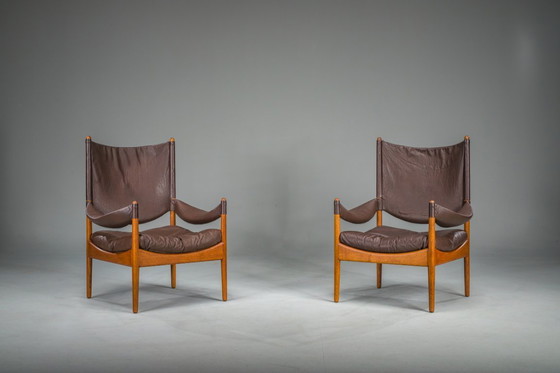 A rare and authentic set of two lounge chairs with a matching ottoman, designed by Kristian Vedel for Søren Willadsen Møbelfabrik, Denmark, 1960s. Crafted from solid oak with beautifully refined joinery, the frames have been carefully refreshed, preserving the original character and warm tone of the wood. The supple brown leather has been professionally cleaned and conditioned, retaining its natural patina while enhancing comfort and durability.