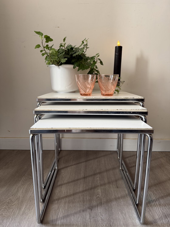 Bellissimo set di tavolini impilabili Mimi con struttura tubolare cromata e un elegante piano bianco. Un set super grazioso, in perfetto stile anni '70: pulito, pratico e deliziosamente minimalista. Si uniscono e si separano facilmente, rendendoli ideali come tavolini.