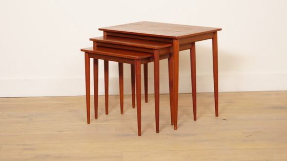 Questo splendido set di tavolini impilabili in teak è composto da tre tavoli. È stato progettato negli anni '60. I tre tavolini hanno un design elegante e raffinato. I tavolini si incastrano perfettamente tra loro.