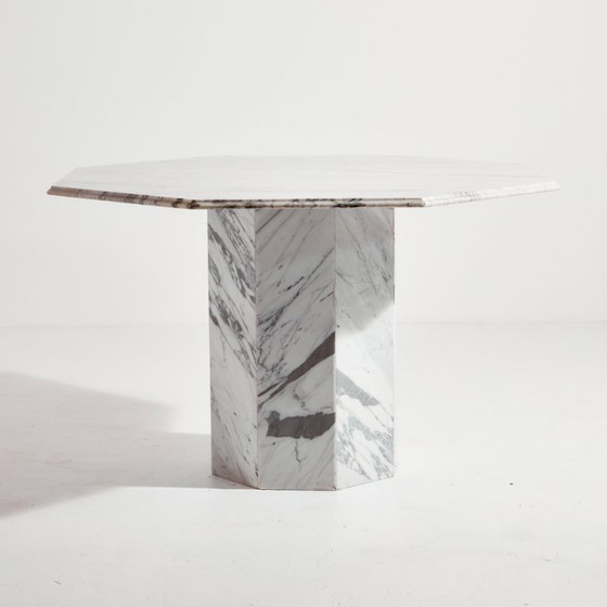 Tavolo da pranzo ottagonale in marmo degli anni Ottanta. La superficie in marmo presenta graffi, macchie e usura in alcuni punti, con alcuni segni d'uso.