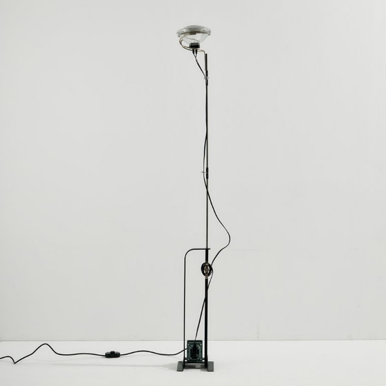 Lampada da terra "Toio" degli anni '60 disegnata da Achille e Pier Giacomo Castiglioni per Flos. La superficie della lampada presenta graffi e segni di usura in alcuni punti.