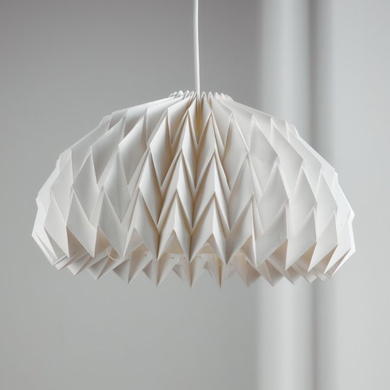 Lampada a sospensione Le Klint con paralume in plastica degli anni '70. Grazie al suo design organico e alla luce affascinante, può essere un elemento di spicco in qualsiasi ambiente. Presenta piccole macchie e ammaccature sul paralume.
