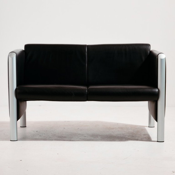 Divano in pelle a due posti "Modello 830" disegnato da Klaus Franck e Werner Sauer per Wilkhahn negli anni '90. Presenta alcuni graffi superficiali e segni di usura sulle parti in pelle e in metallo.
