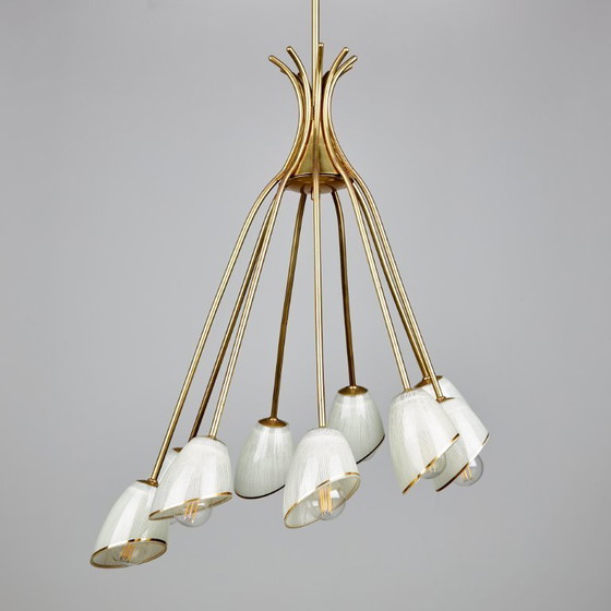 Imponente lampadario in ottone a 9 bracci, di grandi dimensioni, con paralumi in vetro opaco testurizzato, degli anni '50. Presenta alcuni graffi superficiali e segni di usura sulle parti in ottone e vetro.