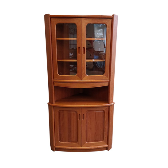 Splendido mobile angolare vintage danese, vetrina angolare con illuminazione. Realizzato in teak e impiallacciatura di teak di alta qualità. Il mobile è dotato anche di un cassetto "segreto". Il mobile è composto da due parti e misura 92 x 58 x 181 cm (L x P x A). È in buone condizioni vintage con lievi segni di usura. Si prega di vedere le foto, che fanno parte della descrizione.