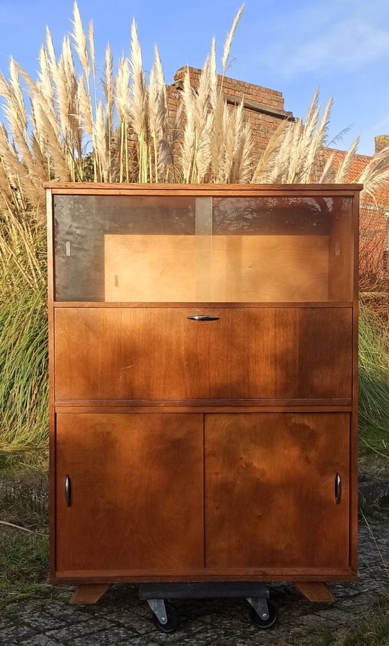 Mobile bar di metà secolo in legno impiallacciato, con qualche segno di usura, nel complesso in buone condizioni vintage.