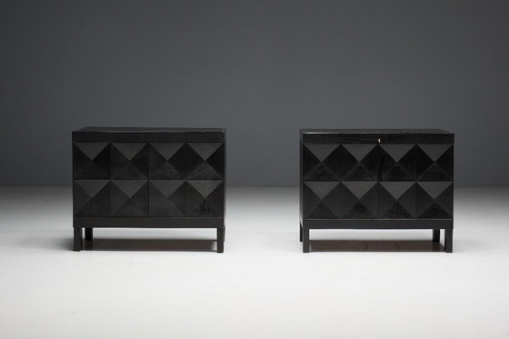 Questi mobili brutalisti di De Coene sono stati realizzati in Belgio negli anni '70. Realizzati in rovere tinto nero, presentano due ante con motivo geometrico a rombi che rivelano un interno spazioso con un ripiano e due cassetti. Le linee pulite e la superficie strutturata gli conferiscono una presenza scultorea e ritmica. Venduto singolarmente, due pezzi disponibili.