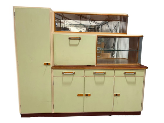 Il mobile è costruito in legno massiccio e superfici impiallacciate, con ante dipinte di crema chiaro e ferramenta originale. La parte superiore comprende un espositore in vetro arrotondato con ripiani in vetro originali, mentre la parte inferiore contiene spaziosi armadietti e cassetti con maniglie in metallo e accenti tipici dell'epoca.