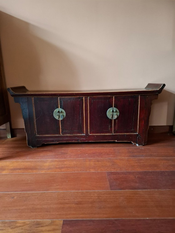 Questa graziosa credenza cinese porta un tocco di eleganza orientale nella tua casa. Con il suo intenso colore bruno-rossastro e le tradizionali chiusure in metallo, è un vero e proprio colpo d'occhio che unisce stile e funzionalità.