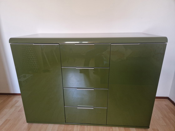 Mobile credenza verde oliva con dettagli cromati e angoli arrotondati