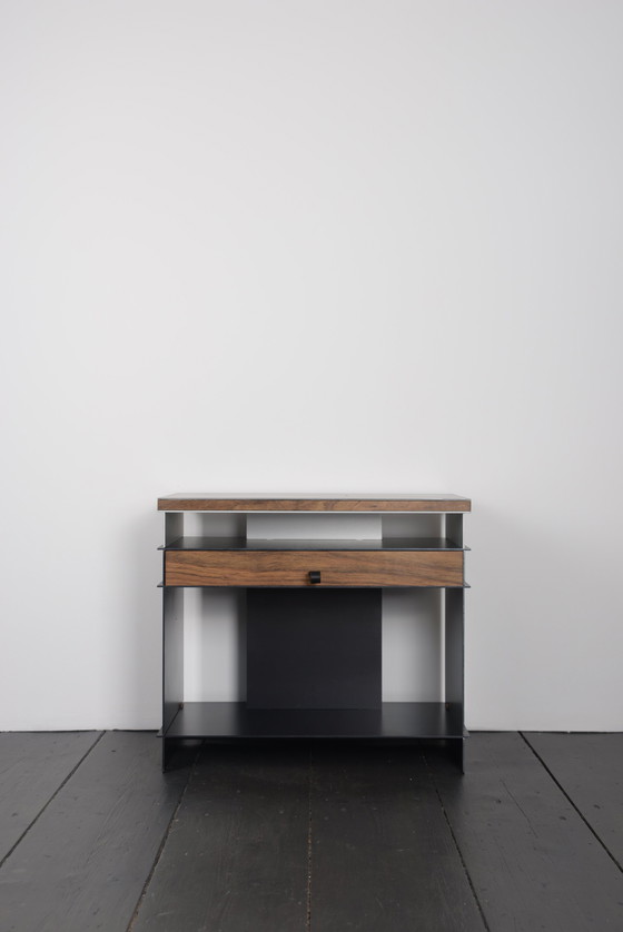 I mobili campione sono realizzati in acciaio laminato a caldo, il cassetto e il bordo superiore sono in legno amazakoue (e l'interno del cassetto è in acero). La maniglia del cassetto è in cuoio. Il mobile è nuovo e integro. Viene fornito nella sua confezione originale. Poiché il mobile è ancora nelle sue scatole, le prime foto sono foto del prodotto del mobile campione di questo modello specifico.