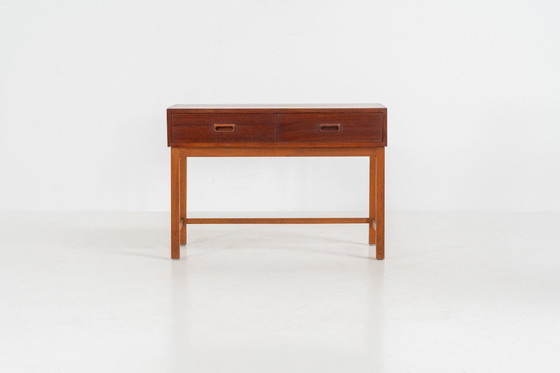 Un elegante mobile da ingresso in teak, sorretto da gambe in rovere.