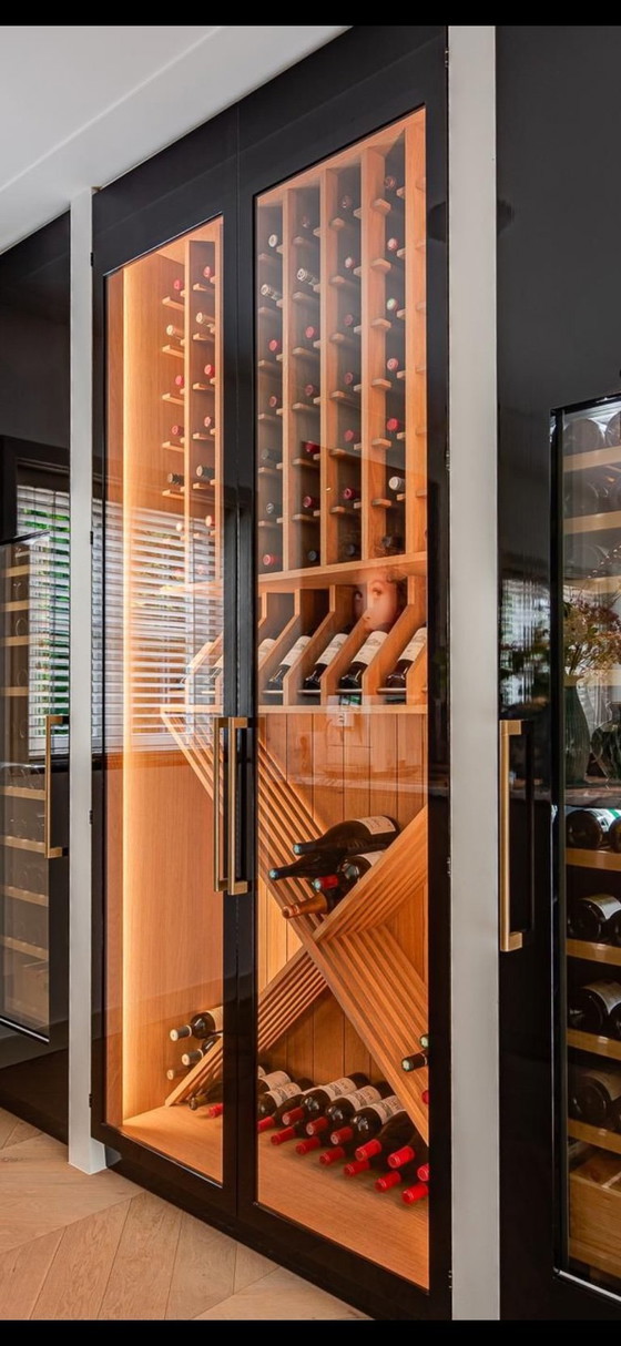 Bellissimo mobile portabottiglie su misura di Lodder Keukens, realizzato in rovere affumicato.