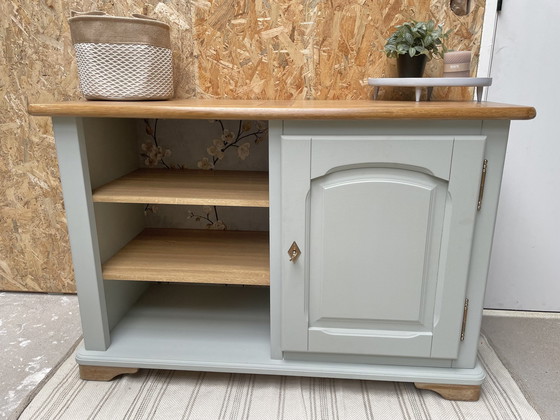 Questo mobile porta TV è stato rinnovato. Presenta una splendida tonalità pastello di Gentle Green e una deliziosa carta da parati floreale sul retro. Anche i ripiani interni sono rimovibili.