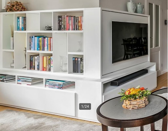 La parte superiore di questa sezione presenta uno scomparto per riporre piccoli oggetti, coperto da un ampio piano girevole su cui è montato il televisore. Ruotando questo top, il vano diventa accessibile, ma in posizione piatta il vano non è visibile. Il piano girevole con TV consente quindi una migliore visione del televisore in posizione angolata, ruotando il piano, con un angolo di circa 30*.