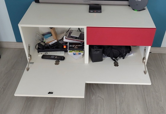 Questo elegante mobile TV di Castelijn unisce design moderno e funzionalità pratica. L'elegante finitura bianca è splendidamente accentuata da un sorprendente cassetto rosso, che lo rende un punto focale in qualsiasi soggiorno.