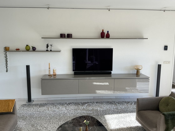 Mobile a parete sospeso moderno Interlubke a 3 elementi, nuovo, colore tortora. Dimensioni: 300 cm di lunghezza x 46 cm di profondità x 50 cm di altezza. Completo di mensole a muro abbinate, 2 da 150 cm e 1 da 300 cm di lunghezza. Le mensole sono larghe 25 cm.