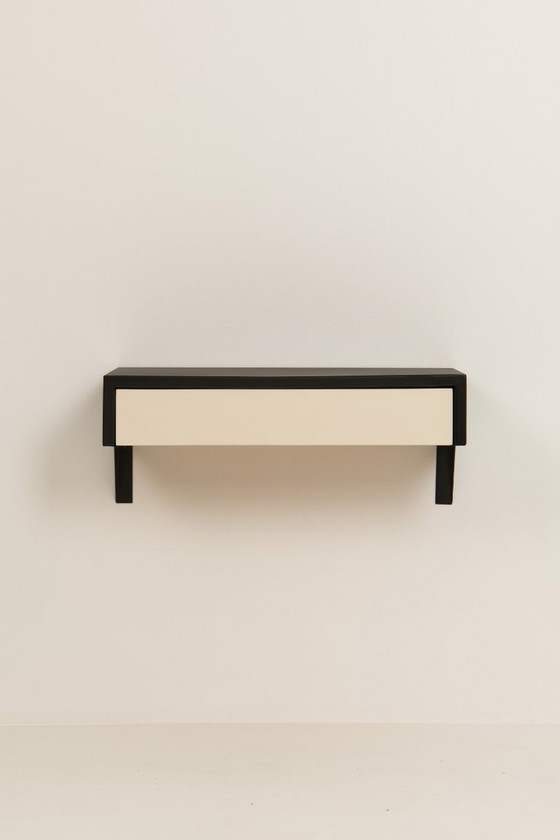 È costituito da una struttura in metallo laccato nero, montata a parete, e da un cassetto in legno. La parte esterna del cassetto è stata rifinita in bianco. La disposizione delle parti in legno, combinata con le giunzioni a vista, crea un effetto estetico interessante.