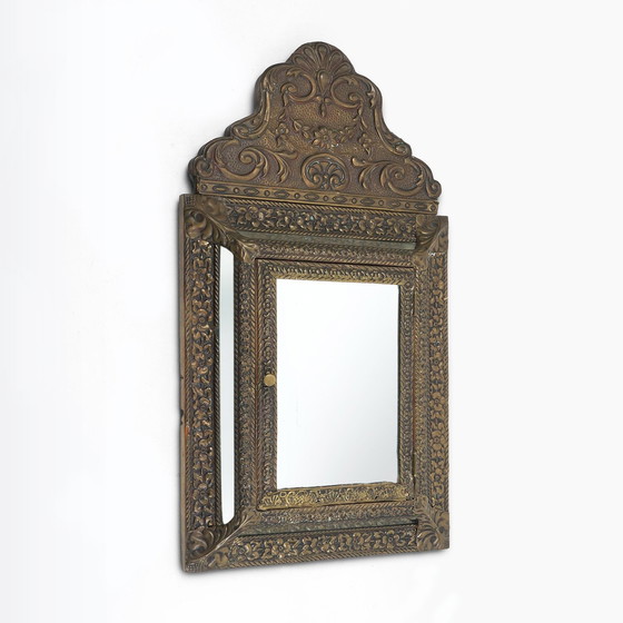 Francia / Anni '30 / Specchio con contenitore / Legno, rame / Art Déco / Metà secolo Un mobiletto a specchio francese con due piccoli ganci interni per le chiavi. Lo specchio ha una cornice con decorazioni a rilievo in rame su legno. Questo pezzo decorativo Art Déco è stato realizzato negli anni '30. Lo specchio ha un bellissimo aspetto invecchiato con piccole macchie e macchie scure. Dimensioni anta a specchio: 25 cm x 17 cm Rif. 25-0060