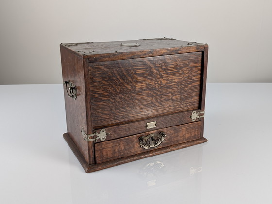 Antico mobiletto da scrivania vittoriano realizzato nell'Inghilterra del XIX secolo, realizzato in legno di rovere scuro con venature ben definite e ferramenta originale d'epoca in metallo argentato. Si tratta di un modello davvero insolito, caratterizzato da un ingegnoso design meccanico: il pannello frontale a tamburo si abbassa automaticamente all'apertura del cassetto inferiore e si solleva nuovamente alla chiusura del cassetto, creando un effetto funzionale e teatrale. Sebbene il meccanismo sia ancora funzionante, il tamburo richiede una leggera spinta manuale per chiudersi completamente. L'interno è dotato di numerosi scomparti per lettere, documenti e strumenti di scrittura, inclusi divisori sagomati ideali per organizzare la cancelleria. All'interno del cassetto si trova un calamaio quadrato in vetro con coperchio filettato in ottone, sormontato da un motivo a corona vittoriana, un autentico tocco storico. Il mobiletto è numerato e conserva la sua chiave originale. Un oggetto di splendida fattura, ideale per gli appassionati di scrittura antica, gli interni d'epoca o i collezionisti di curiosità meccaniche e da scrivania.