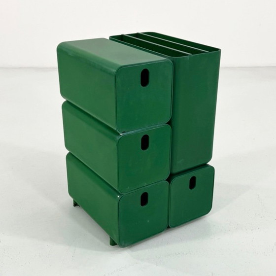 Scopri questo mobile contenitore per ufficio verde, progettato da Georges Coslin per Longato negli anni '60. Questo pezzo incarna l'eleganza funzionale del design italiano dell'epoca, con il suo colore verde brillante e la robusta struttura in plastica.