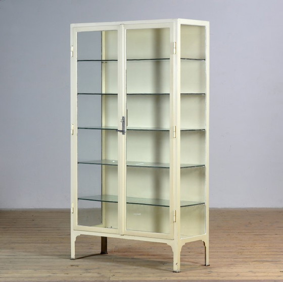 Mobiletto medico degli anni '30, proveniente dall'Ungheria. Questo mobiletto trasuda carattere e maestria artigianale, con la sua robusta struttura in ferro spesso e il vetro antico originale. L'autentica serratura e l'elegante maniglia sono perfettamente funzionanti e conferiscono al mobiletto un aspetto robusto e industriale. È inoltre dotato di ripiani in vetro originali da 8 mm di spessore. I ripiani presentano una sfumatura verde dovuta al piombo presente nel vetro.