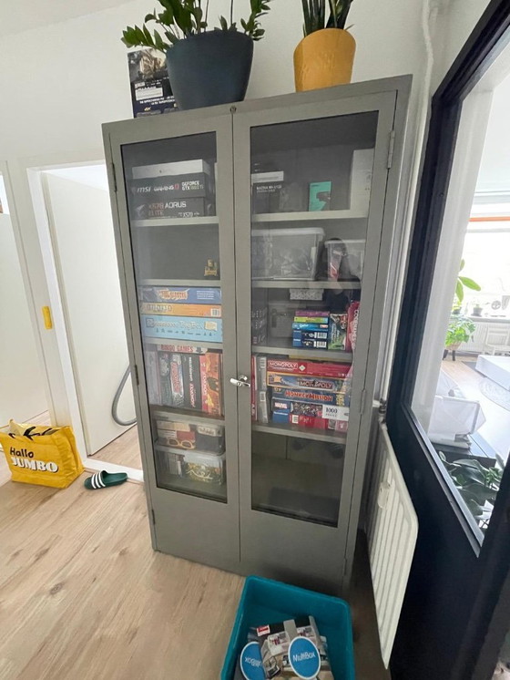 Bellissimo mobiletto Gispen in vendita. Non so se si tratti di un armadietto per medicinali o di un armadietto da laboratorio. Le ante sono chiudibili a chiave. Il mobiletto è realizzato interamente in acciaio con ante in vetro. È dotato di diversi ripiani che possono essere appesi all'altezza desiderata. Nota: quando è vuoto, il mobiletto potrebbe ribaltarsi se entrambe le ante sono aperte. Un dettaglio da tenere presente.