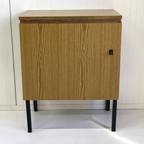 Macchina da cucire anni '60/'70, design elegante con impiallacciatura in legno e gambe in metallo nero. La macchina da cucire è stata rimossa e sono stati installati un ripiano e una base bianchi. La serratura funziona e la chiave originale è inclusa. Presenta solo lievi segni di usura ed è stata ispezionata e pulita. Dimensioni: L61 x P41 x A77 cm.