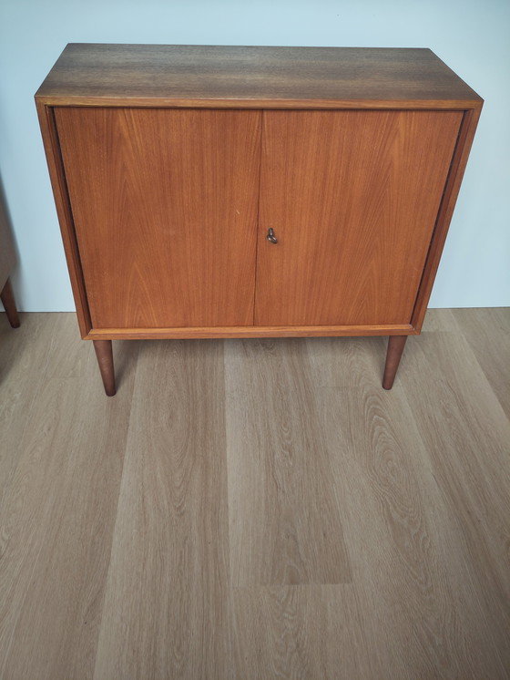 Il mobile è dotato di doppie ante con un'elegante serratura in metallo (chiave inclusa), poggia su gambe sottili e affusolate ed è rifinito in caldo teak impiallacciato. All'interno, un ripiano regolabile offre ampio spazio di archiviazione.