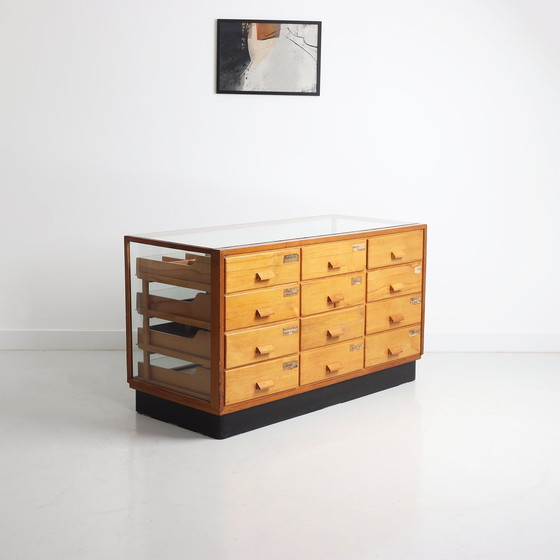 Dimensioni dell'espositore per camicette inglesi: – Lunghezza: 150 cm – Profondità: 65 cm – Altezza totale: 85 cm – Altezza zoccolo: 11 cm Dimensioni specifiche: Cassetti: – Lunghezza: 45 cm – Profondità: 59 cm – Scomparti portaoggetti: 14,5 cm