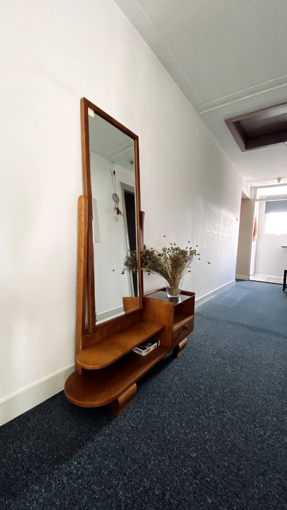 Mobile da ingresso vintage in stile Art Déco con specchio, piano in vetro e cassetto. Anni '50 (?), con gambe decorative.
