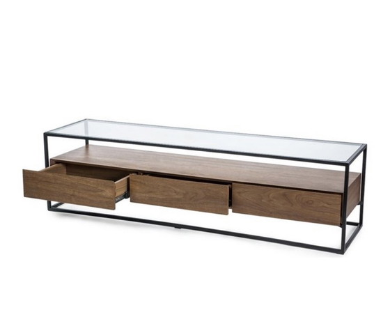 Questo moderno mobile TV di Casa Padrino ha un design elegante con una combinazione di legno, metallo e vetro. Il piano in vetro trasparente crea un look contemporaneo, mentre i cassetti in legno offrono un ampio spazio di archiviazione. La struttura in metallo aggiunge stabilità e un tocco di stile industriale. Perfetto per qualsiasi salotto moderno.