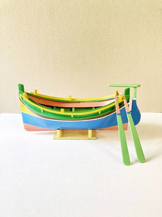 Incantevole modellino di una tradizionale barca da pesca maltese, realizzato in legno dipinto, completo di timone, remi e supporto. I suoi splendidi colori vivaci lo rendono perfetto per decorare la cameretta di un bambino o per aggiungere un tocco esotico e luminoso alla vostra casa.