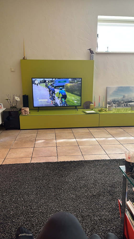 Questo elegante set di mobili Molteni è perfetto per gli spazi abitativi moderni. Il set è caratterizzato da un vivace colore verde ed è realizzato in legno di alta qualità, resistente ed elegante. Ideale come mobile porta TV, offre ampio spazio di archiviazione e un design contemporaneo che si adatta a qualsiasi arredamento. I due mobili base (con cassetti e ante a ribalta) misurano 144,5x65,5x28 cm ciascuno. Il pannello posteriore misura 144,5x10x96,5 cm e il mobile pensile misura 36x52x144,5 cm. Tutte le dimensioni sono LxPxA.
