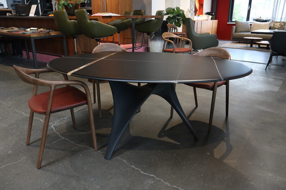 Tavolo da pranzo Molteni&C ARC - 180x120 L'Arc di Molteni&C. Un bellissimo tavolo ovale con piano in marmo. Gli spigoli vivi sono già stati rimossi per voi, conferendo al tavolo un aspetto splendidamente rotondo, liscio e morbido. Il marmo nero ha un disegno a linee nette. Il marmo è rinforzato nella parte inferiore. Molteni&C ha scelto questo perché i piani in marmo di tali dimensioni hanno un peso così elevato che è auspicabile un supporto extra. La base su cui poggia il piano ricorda una combinazione di dipinti di Escher e le volte degli edifici ecclesiastici. È realizzata in cemento al carbonio, che conferisce a questo tavolo la resistenza che merita. Marchio: Molteni&C Modello: Arc Versione piano: marmo, Sahara Noir Base: cemento al carbonio, grafite Dimensioni: L180 x P120 x H73 cm Nota di stile: maniglie sottili e dettagli splendidamente rifiniti.