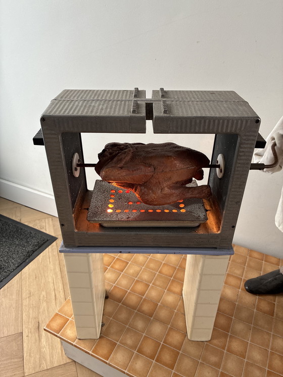 Il braccio ruota lo spiedo e la testa si muove; il colore rosso della tostatura è visibile nella foto.