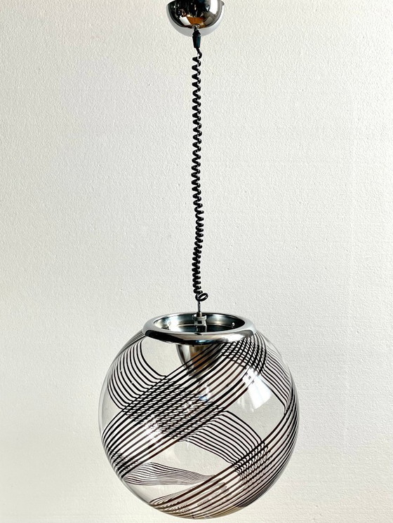 Lampada a sospensione in vetro di Murano degli anni '70, attribuita al maestro vetraio Lino Tagliapietra. Il globo in vetro trasparente presenta linee fluide in un intenso paralume ametista, proiettando accattivanti giochi di luce e ombra quando è acceso. Montatura cromata e filo a spirale originale. Uno splendido pezzo di design vintage italiano, ideale per impreziosire qualsiasi interno.
