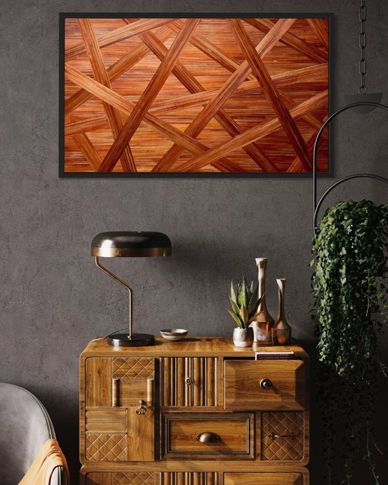 Quadro a intarsio di paglia, motivo a nastro, tonalità ramata molto luminosa che gioca enormemente con la luce.