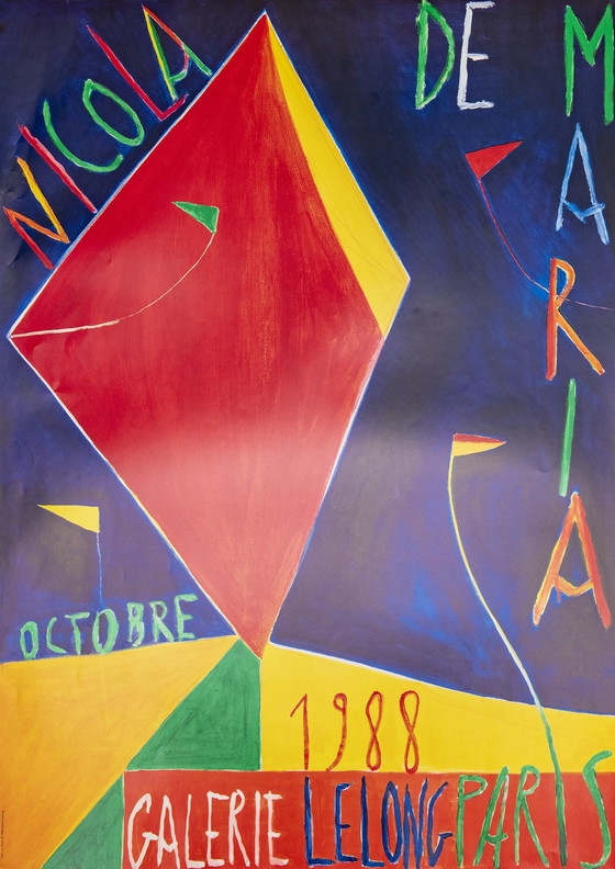 Questo è un manifesto espositivo creato dal famoso artista Nicola de Maria per una mostra del 1988 alla Galerie Lelong di Parigi. L'opera mette in risalto la capacità unica di De Maria di fondere colori e forme in composizioni dinamiche. In buone condizioni, con minimi segni di conservazione, questo manifesto è un esempio per eccellenza del suo lavoro della fine degli anni '80. Con un formato di 70,5 x 50,0 cm, è un'aggiunta perfetta per i collezionisti interessati ai manifesti espositivi e all'arte moderna.