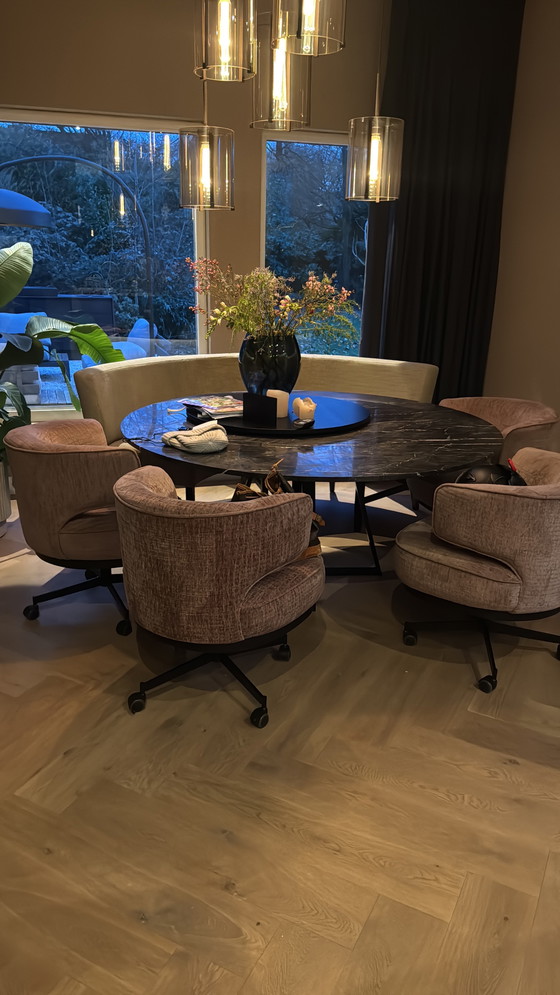 Eleva la tua esperienza culinaria con questo squisito set completo per la sala da pranzo, composto da un magnifico tavolo in marmo e comode sedie. Il tavolo rotondo, con un generoso diametro di 175 cm, funge da elegante centrotavola, offrendo ampio spazio per pranzare e conversare.