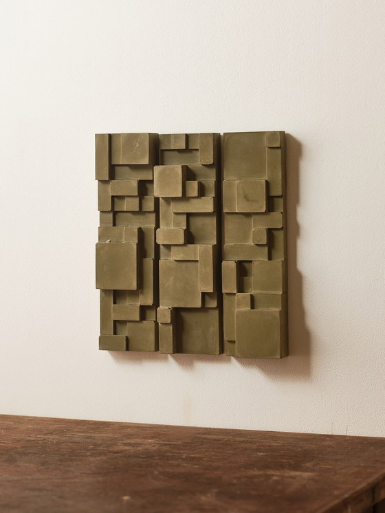 Set di tre sculture da parete in cemento realizzate a mano. Ogni pannello (22,4 × 6,4 cm) presenta un rilievo geometrico con altezze variabili, creando ombre che cambiano con la luce. Ispirati all'architettura brutalista e al design Bauhaus, i pannelli possono essere disposti in diversi ordini o ruotati per un effetto variegato. La finitura in cemento grezzo e terroso ne enfatizza la forma e la texture. Adatto ad interni moderni, industriali e minimalisti.