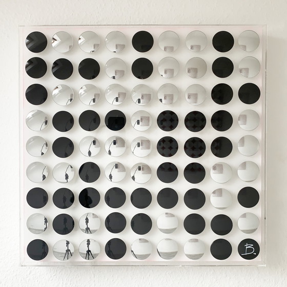 Dimensioni: circa. 55,5 x 55,5 x 8 cm Estratto dal testo del sito web dell'artista: "Riflessi, motivi geometrici e colori sono al centro dell'opera dell'artista op art L.J. Billion. Poiché l'artista lavora principalmente con materiali riflettenti, non è tanto l'opera d'arte che si vede, quanto piuttosto il riflesso dell'ambiente circostante. Ciò significa che un'opera d'arte non appare mai uguale, a seconda dell'ora del giorno, delle condizioni di illuminazione, dell'angolazione, ecc. Quando l'osservatore si riflette nell'opera d'arte, ne diventa parte. Questo incoraggia molte persone a interagire con l'opera d'arte attraverso il movimento. Per questo motivo, l'artista definisce la sua arte "cinetica-passiva".