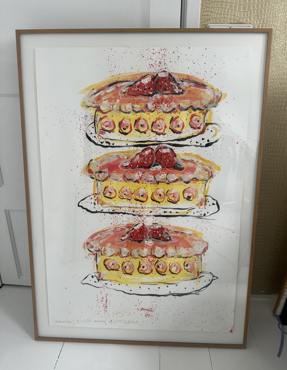 Si tratta di un'opera d'arte vivace e moderna intitolata "Holland Bakt", realizzata nel 2013 dall'artista Gé Smit. Mostra una rappresentazione giocosa di tre torte, ciascuna decorata con fragole e schizzi di colore. L'opera è incorniciata in un'elegante cornice di legno che aggiunge un tocco di eleganza. Le misure sono 80 x 110 cm, quindi si tratta di un pezzo consistente che può essere un punto focale in qualsiasi stanza. L'opera d'arte è firmata e datata, il che ne aumenta l'autenticità e il fascino.