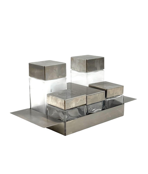 Hollywood Regency Cruet-Set Manifattura Zani Italia, anni '70. Set in acciaio e vetro, composto da vassoio a sezione rettangolare, oliera, acetiera, sale, pepe e formaggiera con cucchiaio, reca il marchio alla base. H cm set montato 13,5×28,5×12 cm Condizioni: Eccellenti, nessun difetto