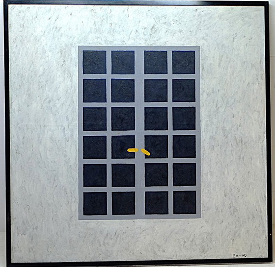 Scopri questa moderna opera d'arte del pittore finlandese Pauli Vuorisalo, datata 1970. Questo olio su tela presenta un accattivante motivo geometrico, dominato dai toni del bianco e del nero, con un tocco di giallo vibrante. Ideale per aggiungere un tocco artistico e contemporaneo al tuo spazio.